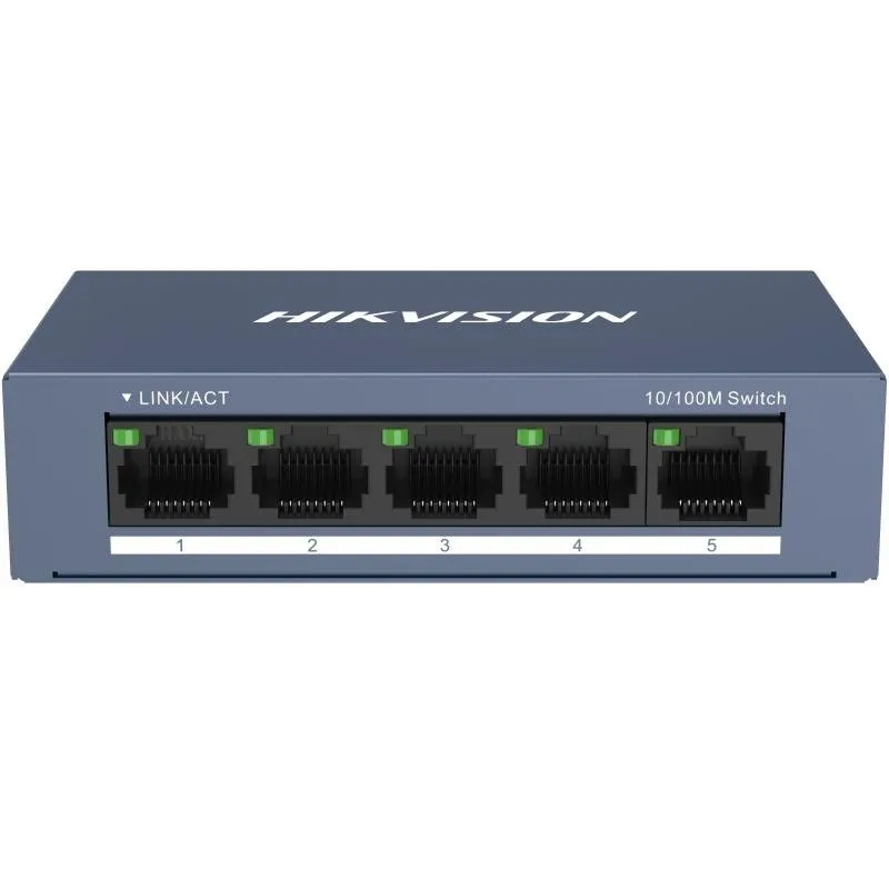 Hikvision 5-Port Fast Ethernet Plastic Switch – DS-3E0105D-O, available at Hikvision Shop in Kenya, offers reliable network connectivity for small setups such as home networks, offices, or small surveillance systems. Equipped with five 10/100 Mbps auto-negotiation Ethernet ports, this switch allows easy connection and expansion of wired devices without configuration.